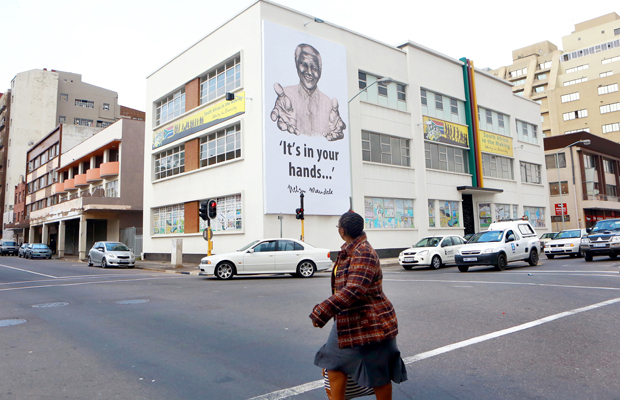 RAJESH JANTILAL [AFP] – Une immense banderole de l’ancien président Nelson Mandela plane au-dessus de l’Hindu Tamil Instituite à Durban le Juillet 17,2013 en préparation pour célébrer le 95ème anniversaire de Nelson Mandela et à commémorer la Journée internationale Nelson Mandela, le 18 Juillet